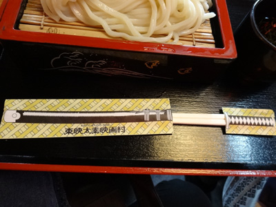 着いた頃はちょうどお昼時だったので、うどん屋さんにて食事。なんか麺類多いね。箸袋の遊び心が嬉しい。