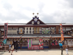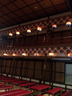 葵座の芝居小屋はこんなに大きくないかもしれないけど、それでも背景画像で見たような外観に内観。つか、看板には『南京玉すだれ』の文字が! ハッチ~!!