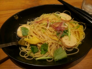 筍と湯葉のおだし系スパゲッティ、ゆず胡椒がアクセント。